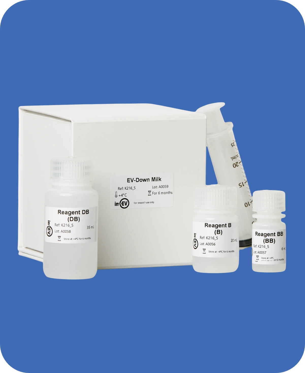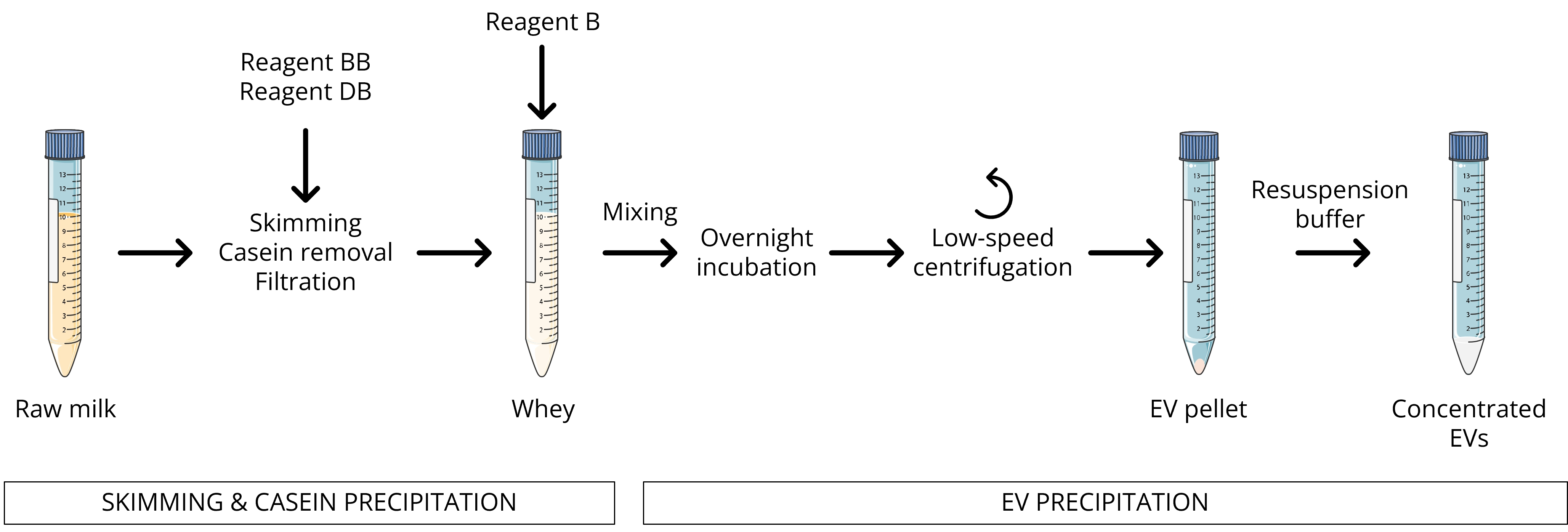 EV-Down Milk kit allows the fast isolation of extracellular vesicles (EVs) from milk, without requiring ultracentrifugation. Milk containing EVs is skimmed, depleted of its casein and then incubated overnight with a reagent that captures water molecules, leading to the precipitation of EVs. By low-speed centrifugations, EVs are pelleted and can be resuspended in the desired buffer, in the desired volume.