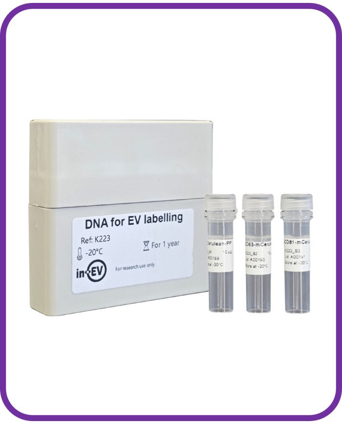 One way to produced labelled extracellular vesicles (EVs) is to bioengineer the producing cells by using DNA. in-EV DNA can be used to transfect cells that will naturally produce labelled EVs in the culture medium. Transient transfections can be performed for fast screening and small scale productions. Transfections to establish stable cell lines are also possible thanks to zeocin resistance.