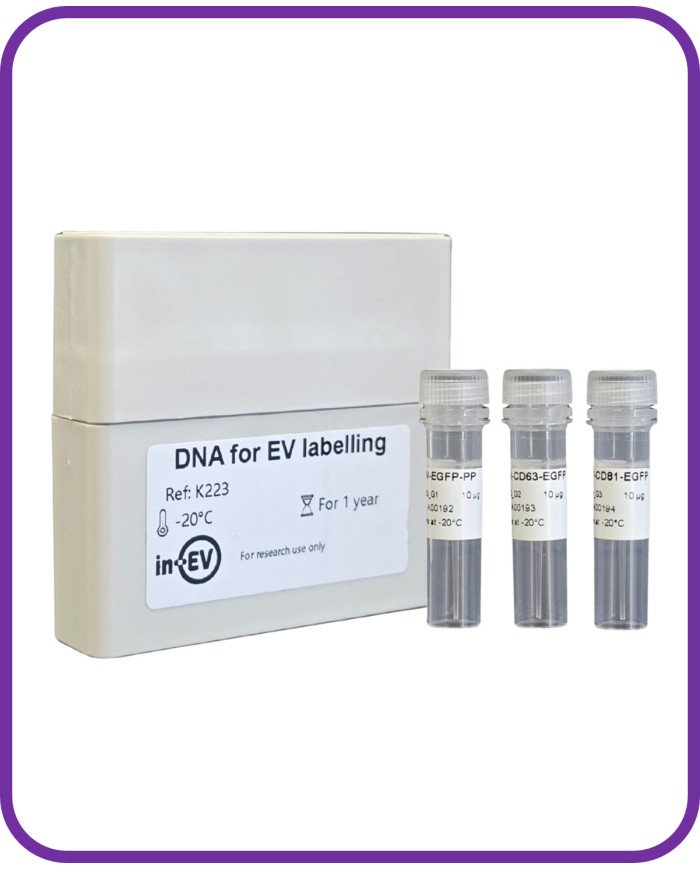 One way to produced labelled extracellular vesicles (EVs) is to bioengineer the producing cells by using DNA. in-EV DNA can be used to transfect cells that will naturally produce labelled EVs in the culture medium. Transient transfections can be performed for fast screening and small scale productions. Transfections to establish stable cell lines are also possible thanks to zeocin resistance.
